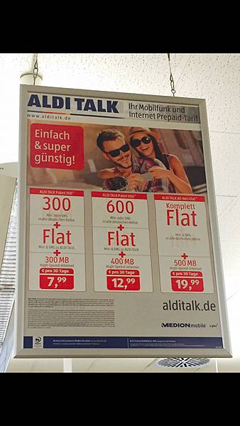 網路真的很重要~我去德國遊學2個月選擇是超市ALDI 它們家的電信公司ALDI talk 個人覺得取得方便 價格也蠻便宜 我們買的是12.99€ 的方案 30天之後加值5€